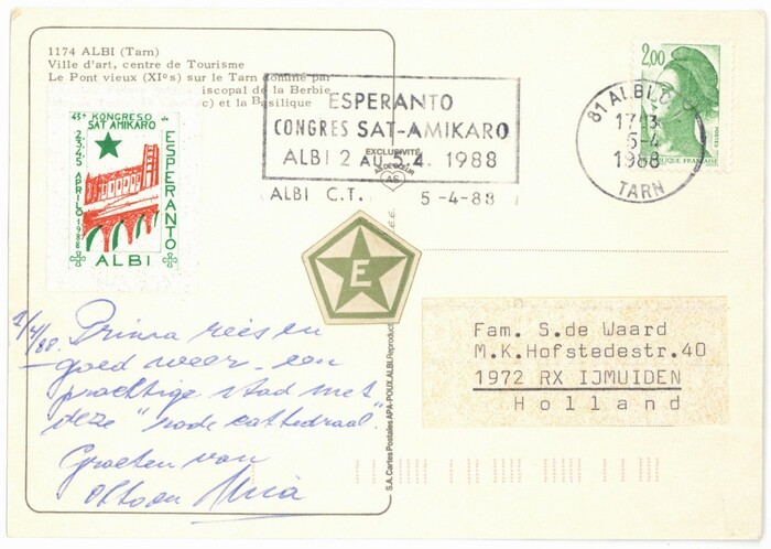 1988年法国阿尔比第44届全世界超民族协会世界语大会实寄封